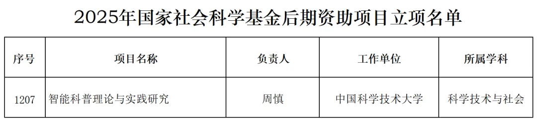 近日,全国哲学社会科学工作办公室正式公布2025年国家社会科学基金后期资助项目立项结果,徽州人工智能研究院学者周慎“智能科普理论与实践研究”项目获批国家社科基金立项。我院2025年立项后期资助项目详见下表。