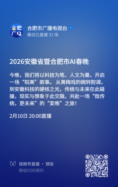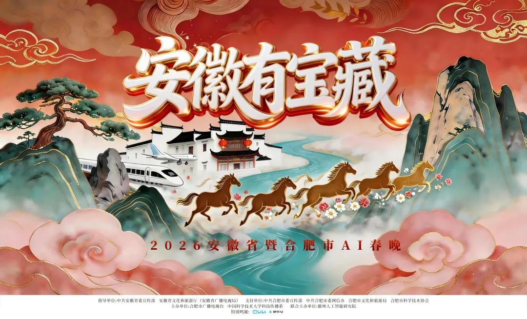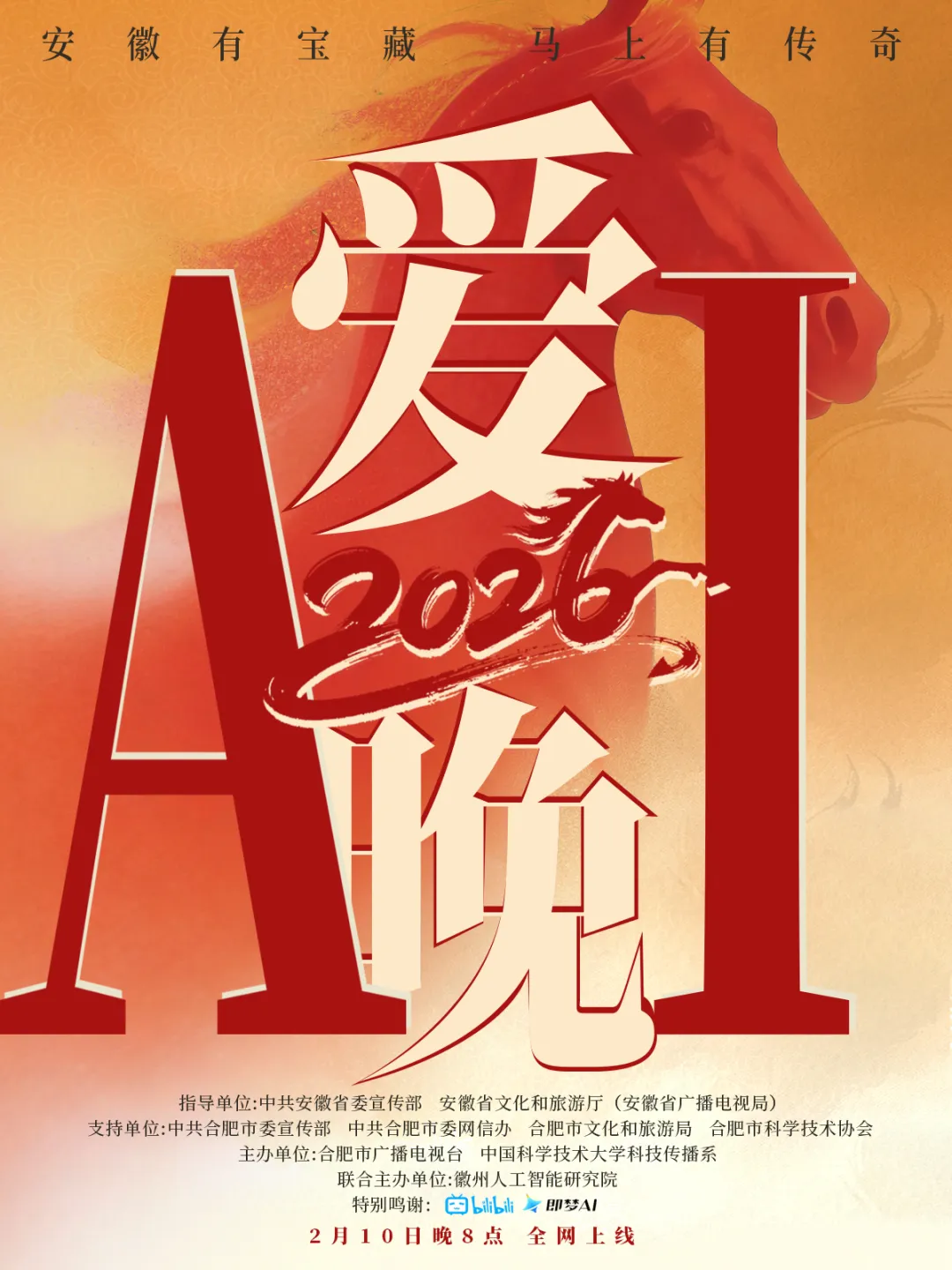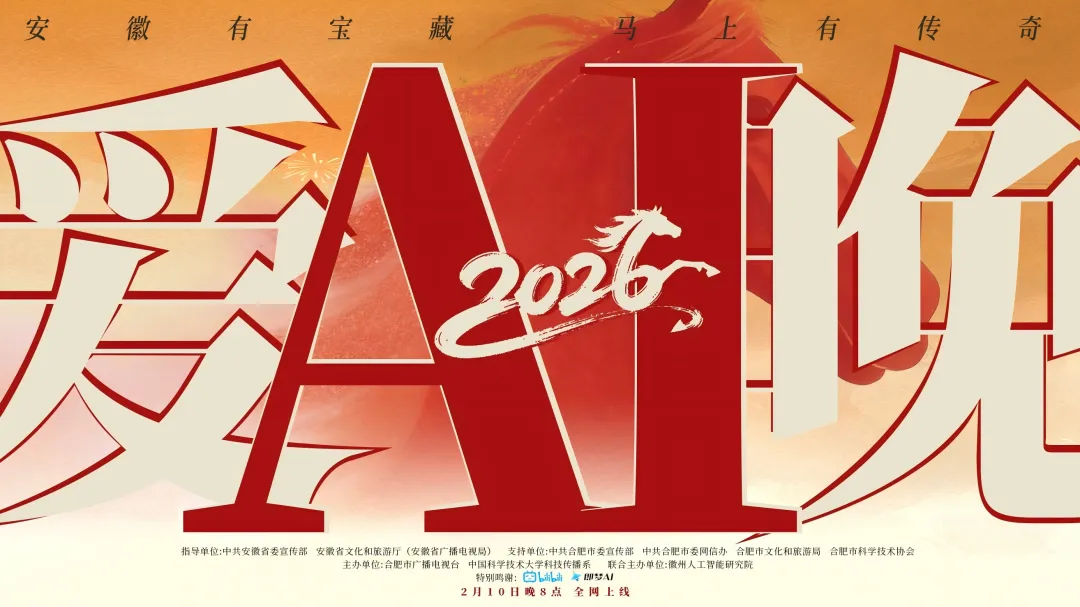 2026年2月10日20:00,由中共安徽省委宣传部、安徽省文化和旅游厅(安徽省广播电视局)指导,中共合肥市委宣传部、中共合肥市委网信办、合肥市文化和旅游局、合肥市科学技术协会作为支持单位,合肥市广播电视台、中国科学技术大学科技传播系、徽州人工智能研究院联合主办的“爱晚2026·安徽省暨合肥市AI春晚”即将上线。
